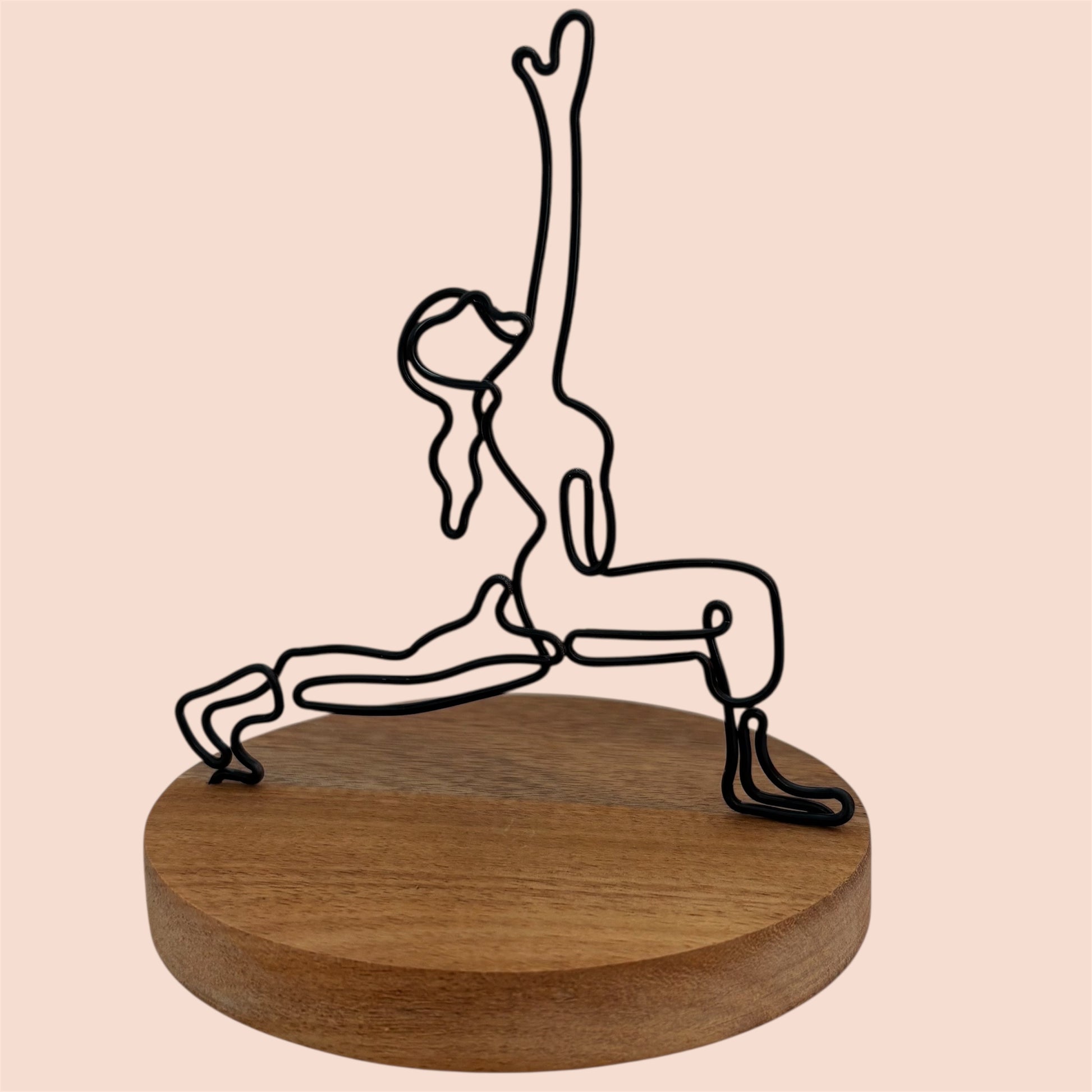 This grounded wire sculpture captures the quiet power of Warrior I—a pose of presence, strength, and steady breath. Formed from a single flowing line, it reflects the union of rooted feet and an open heart, as the body rises with purpose and calm focus. A moment of still strength in motion, it honors resilience through grace. Whether displayed in a personal sanctuary or shared space, this piece brings a quiet confidence and a touch of mindful energy to its surroundings.